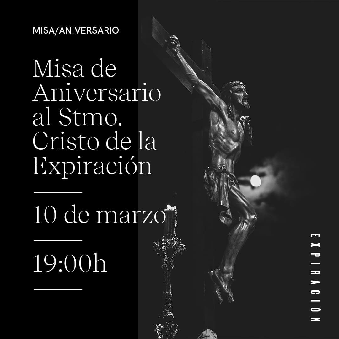 El próximo día 10 de marzo a las 19:00h, tendrá lugar la misa aniversario al Stmo. Cristo de la Expiración en la iglesia parroquial del Apóstol San Pedro.